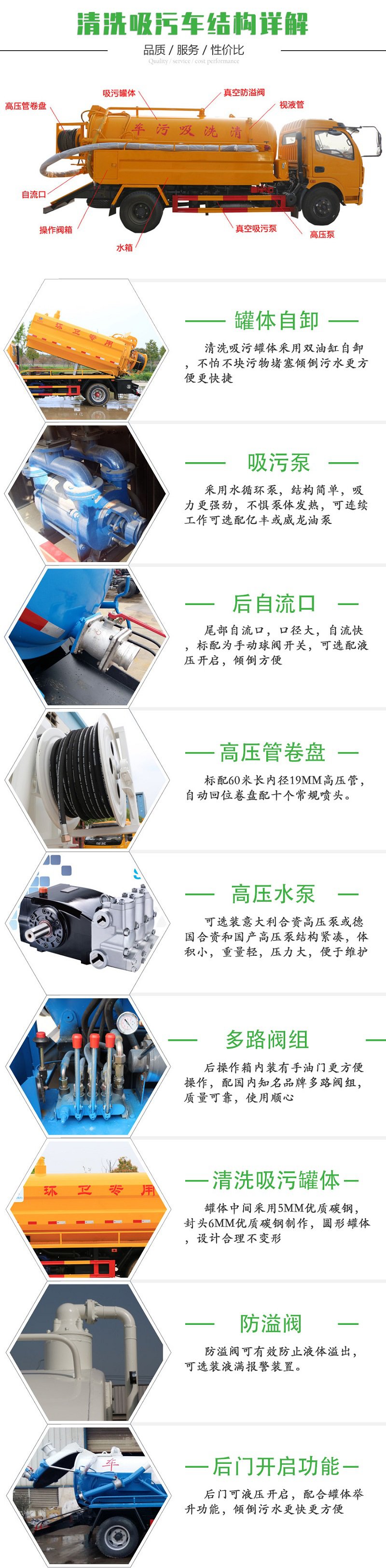 该车装有取力器,真空泵,用于吸污;装有高压水泵,高压水管用于清洗;罐体尺寸(直段长×直径)(mm):5400×2150,罐体前部为清水罐,罐体后部为污水罐,污水罐(直段长×直径)(mm):3000×2150,污水罐有效容积:9.4立方米;清水罐(直段长×直径)(mm):2400×2150,清水罐有效容积:7.52立方米;清水罐和吸污罐为两个**罐体,清洗功能时用水罐,吸污功能时用吸污罐,污水罐和清水罐不可同时装载;整车长/轴距的对应关系为(mm):9900/4375+1400,10100/4575+1400;随底盘选装驾驶室;侧后防护材质为Q23**碳钢,连接方式:左右侧面及后下部防护均采用焊接连接,后部防护断面尺寸(mm):280×50,后部防护离地高度(mm):500;采用发动机型号为:YCS06270-60,WP7.270E61,WP7.300E61;ABS系统生产厂家及型号分别为:西安正昌电子股份有限公司(ZQFB-V). | ||