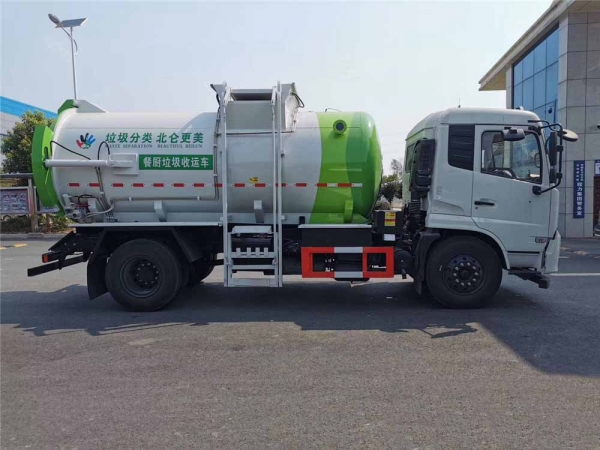 将桶装餐厨泔水垃圾经专用提升架缓缓上提,在车顶部倒入车厢内(车箱可分为箱体和罐体),被投放的垃圾经过强有力的推板挤压,在罐体内实现固液分离,被分离的液体进入罐体底部的污水箱,固体垃圾被压缩储存在罐体,体积变小,如此反复待装满后送**餐厨垃圾资源优化处理厂。