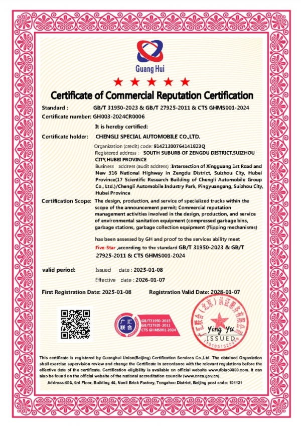 商业信誉认证证书五星级(程力专汽)